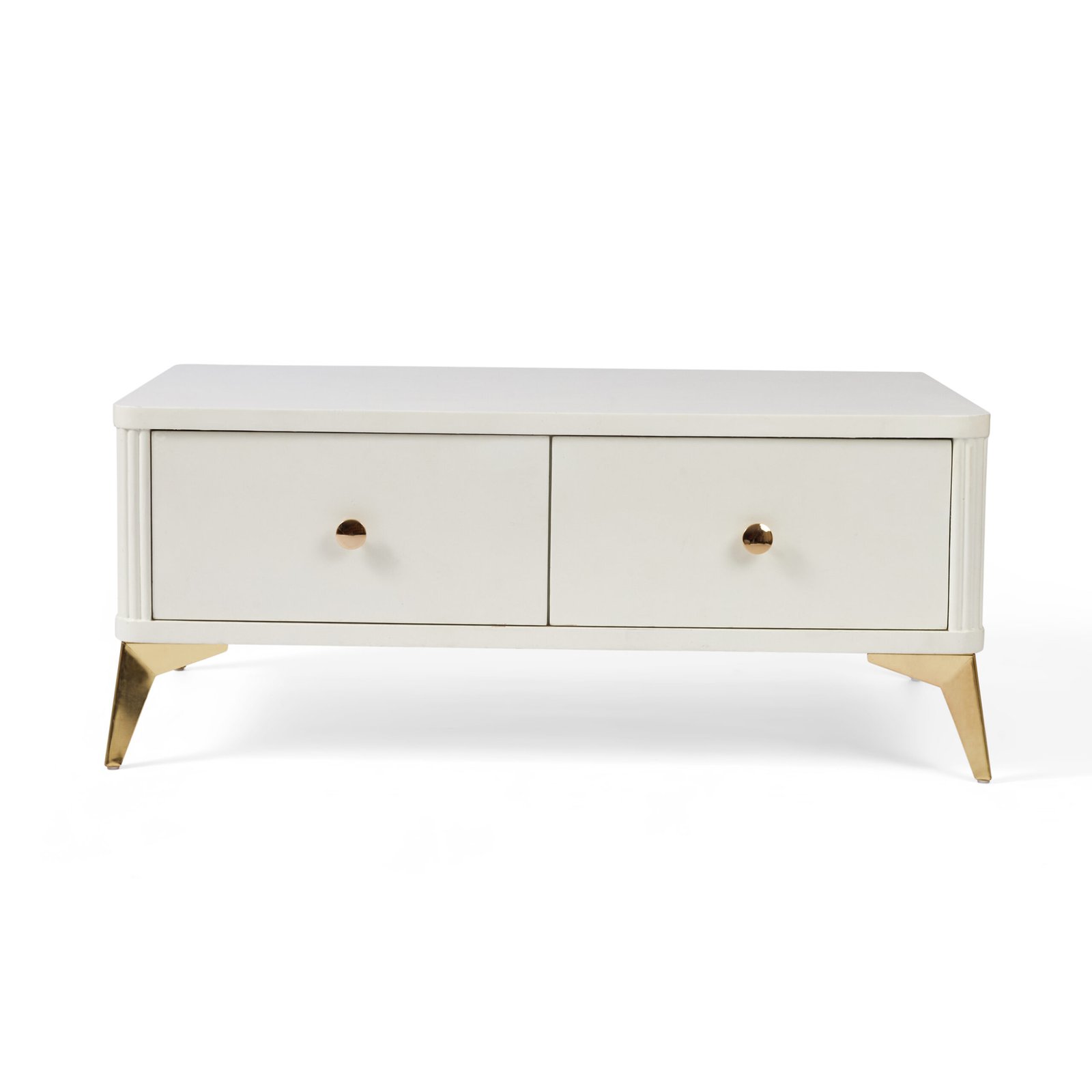 طاولة قهوة أنيقة وعملية بتصميم مودرن. تتميز بلونها الأبيض الأنيق وأرجلها الذهبية الجذابة.